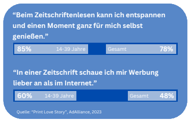 - 60 % der jungen Lesenden schauen sich Werbung in Zeitschriften lieber an als im Internet (Gesamt: 48 %).